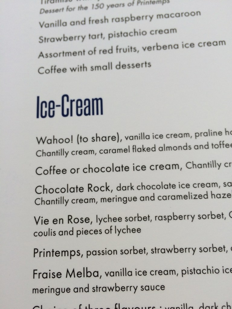 On the 6th floor of Printemps, I settled in for lunch at the Brasserie, under its spectacular cast iron and stained glass dome.