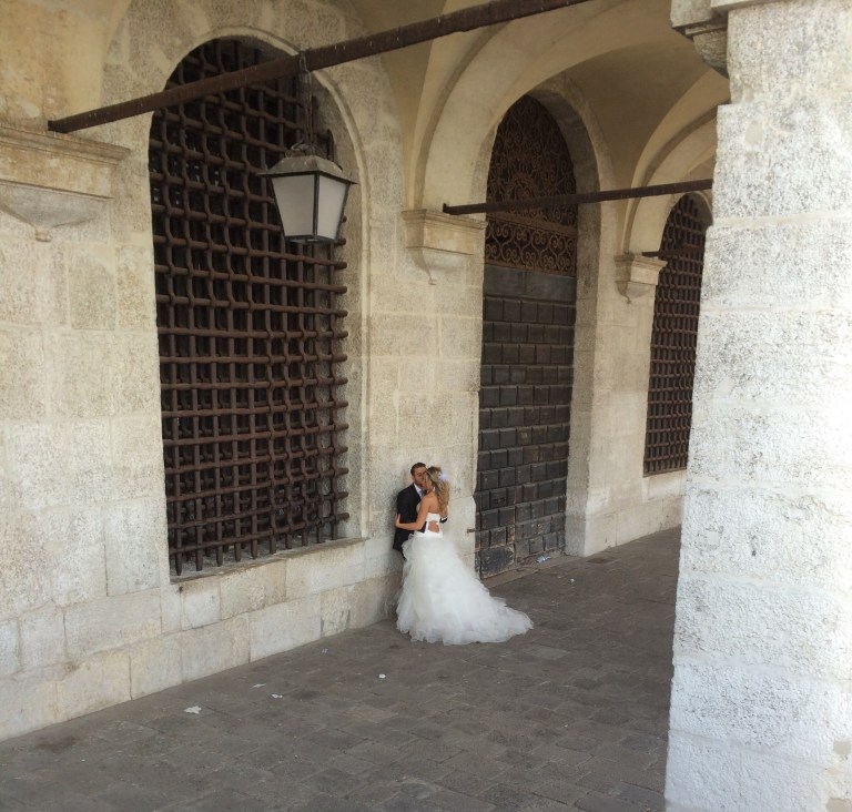 Give this scene any romantic caption you like! The truth is they’re models in an advertising photo shoot. It was interesting watching her navigate the tourist hordes and bridges in her wedding dress.