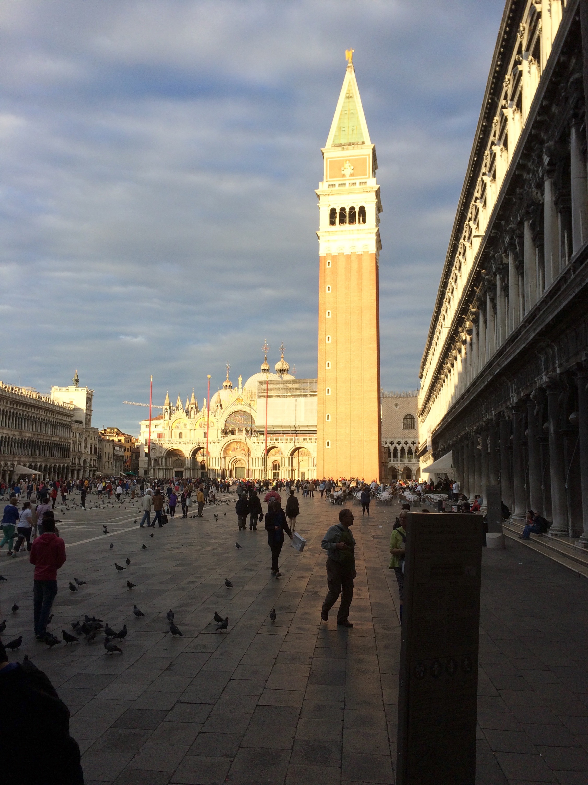 San Marco Plaza is shown above late in the day, with the Basillica and the Campanille in stylistic contrast with one another. The ubiquitous pigeons, those “rats with wings” as New Yorkers have it, still rule and visitors still feed them. The weather is comfortably cool and easy – really nice. My travels here from Paris took 7 hours door-to-door and only involved a 1:20 flight. The rest of the time involved train, bus, and boat trips, and security checks.