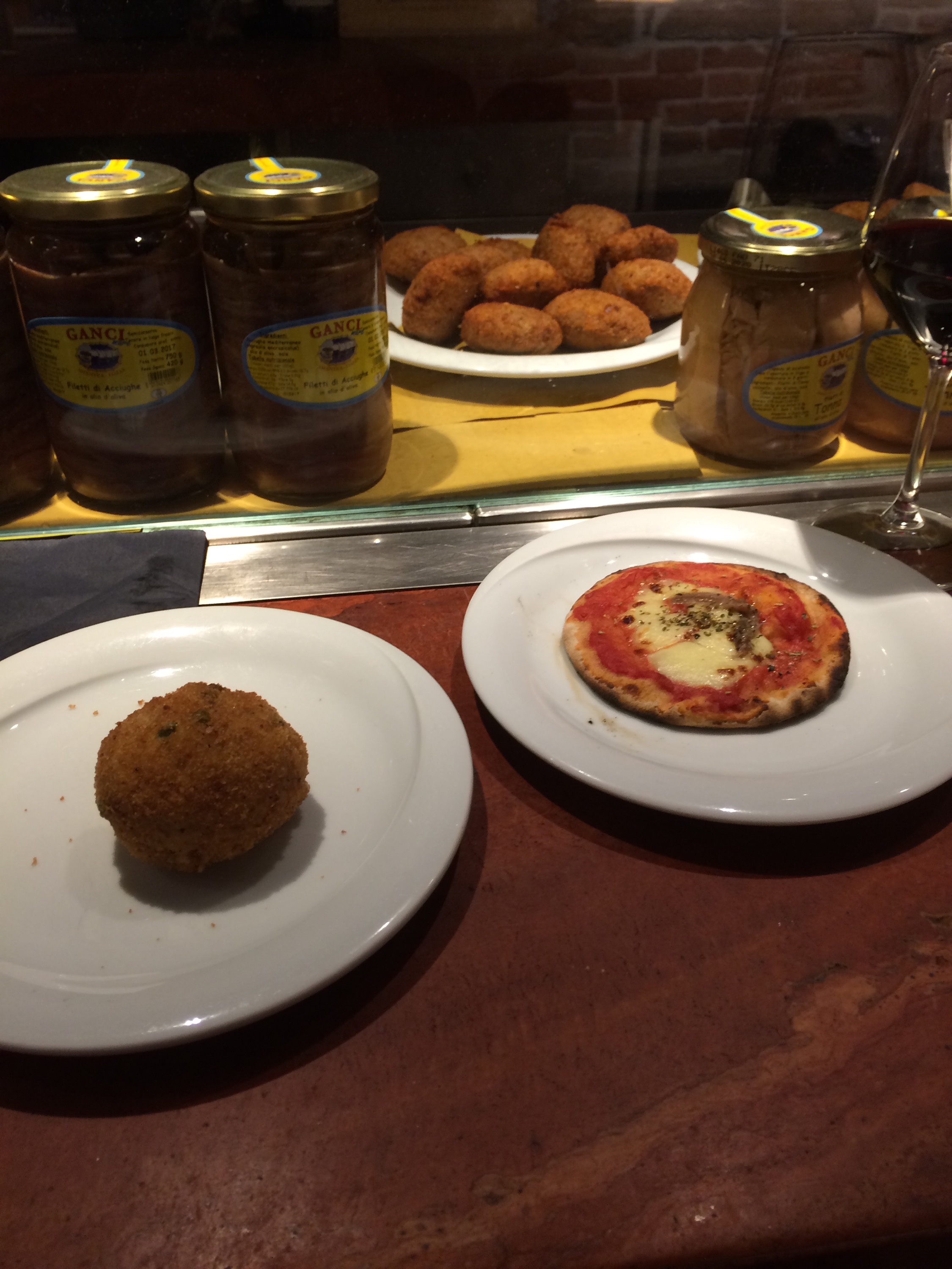 Now here’s a nice Venetian tradition: cicchetti, Venice’s answer to tapas. These tasty treats, each 2-3 bites and made with today’s fresh ingredients, are on offer at bars across the city. You have one or two, with a small glass of wine, chat with locals and other travellers for 10 minutes, and then move on to the next bar. An excellent social event!