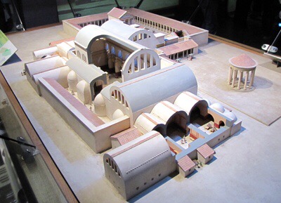 Here’s a scale model of the complex, with the cut-away arched roof over the pool scene in the previous above. Like most Roman baths complexes, it had hot and cold baths, hot and cold rooms, and massage rooms. It also included a temple complex dedicated to the goddess Sulis Minerva. Outside of imperial baths in Rome, this is the largest known bath in the world.