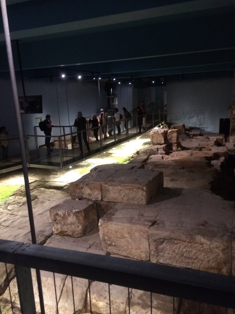 One really cool feature in the tour was at the bottom level. A metal catwalk lets you walk a few feet above the original complex paving stones and you can see the foundations of columns and an altar. Nearby video screens show a succession of views, starting with what you see now and slowly removing the modern features and replacing them with the ancient ones. It’s very well done and has great impact given that you’re standing in the very spot.