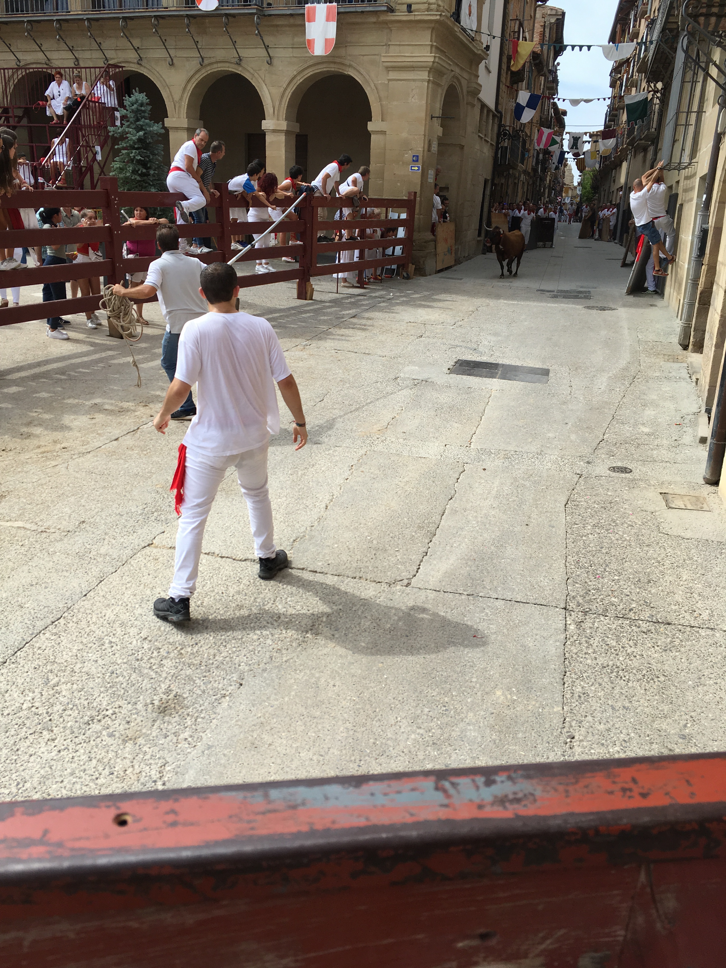 I finally limped into Viana to find a festival going on and parts of the Camino path through town closed for bull running. Yes, just like in Pamplona: bulls in the streets, with men in white shirts and red bandannas baiting them and running like hell. I didn’t care for it; the bulls were scrawny and pitiful looking and it just seemed cruel.