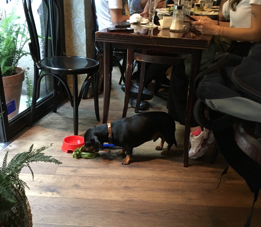 Businesses are pretty accommodating about dogs. The restaurant above, for example, allows them inside and even provides a water bowel, if desired. The city is generally pet-friendly.