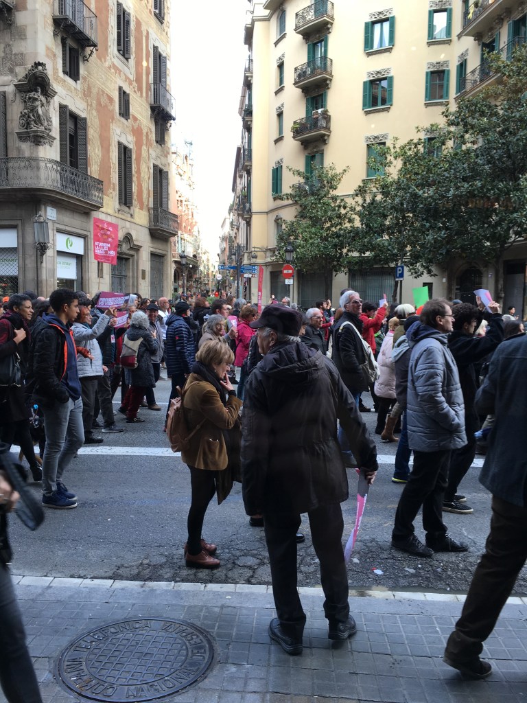 I thought I’d gotten clear of them and a few minutes later settled down into a window seat at a restaurant on a different street for lunch. As I sat there, after a while it dawned on me that something was odd: there was now no traffic on the usually very busy, six-lane wide Via Laietana.
