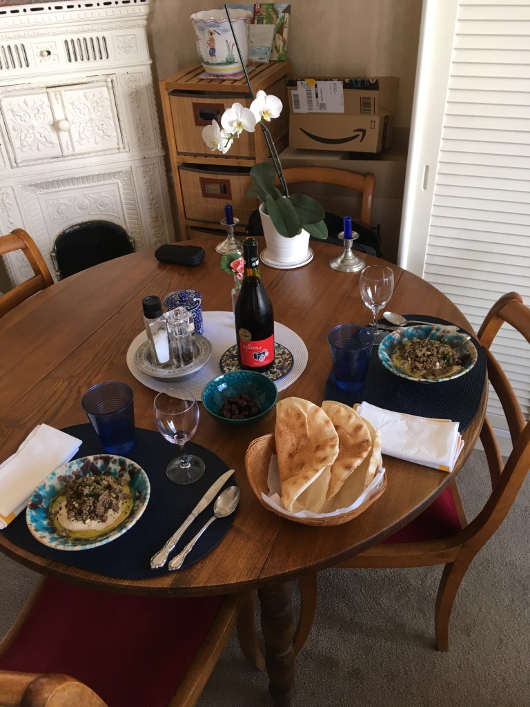 Inspired by The Lebanese Taverna in Arlington, Virginia, we made Hummus Special with pita. This is fresh hummus topped with grilled hamburger/lamb, spices, pine nuts, and olive oil. We accompanied it with a bottle of Le Triporteur, a tasty red blend.