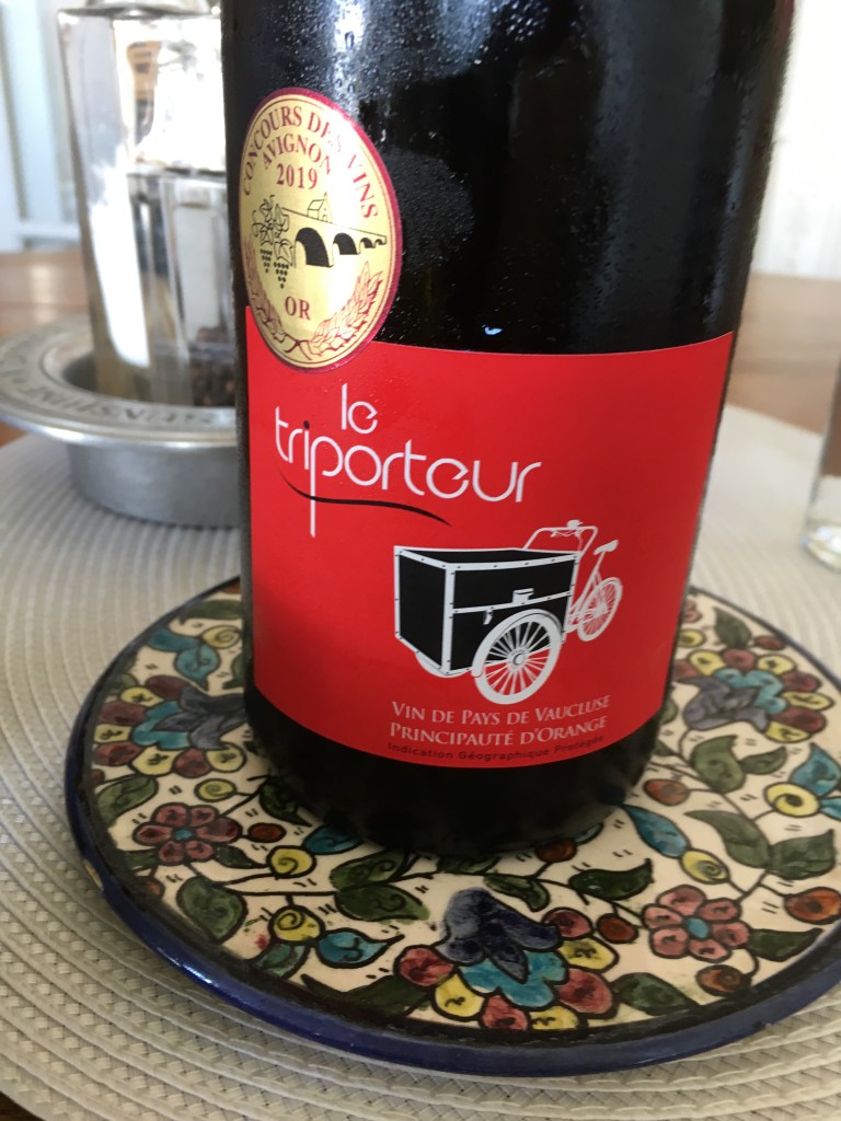 Since you asked, Le Triporteur is an inexpensive Southern Rhone red blend we enjoy, made up of Grenache (70%), Syrah, Caladoc, and Carignan (30%). This is a typical French “bistro” wine, everyday wine that goes with all types of Mediterranean cooking.