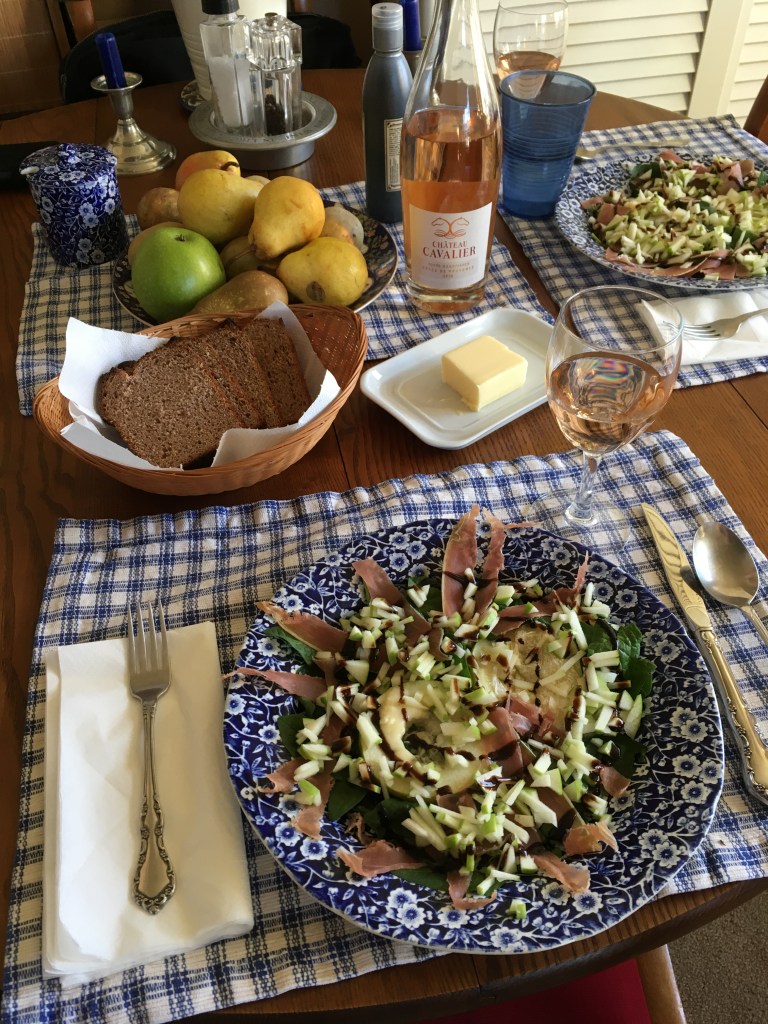 To celebrate the beginning of Spring, we created a salad of apples, bleu cheese, and Parma ham, served with fresh bread and a nice Chateau Cavalier Rosé.