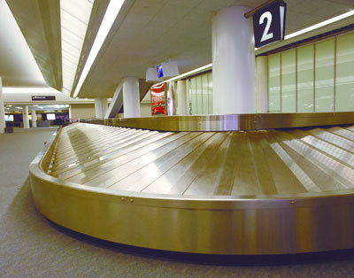 The border and security areas included big halls of empty snaking stanchions and belts, and I went straight through them to be processed. Carry-on screening was slightly modified: belts and shoes stayed on and cell phones went into carry-on bags for scanning.