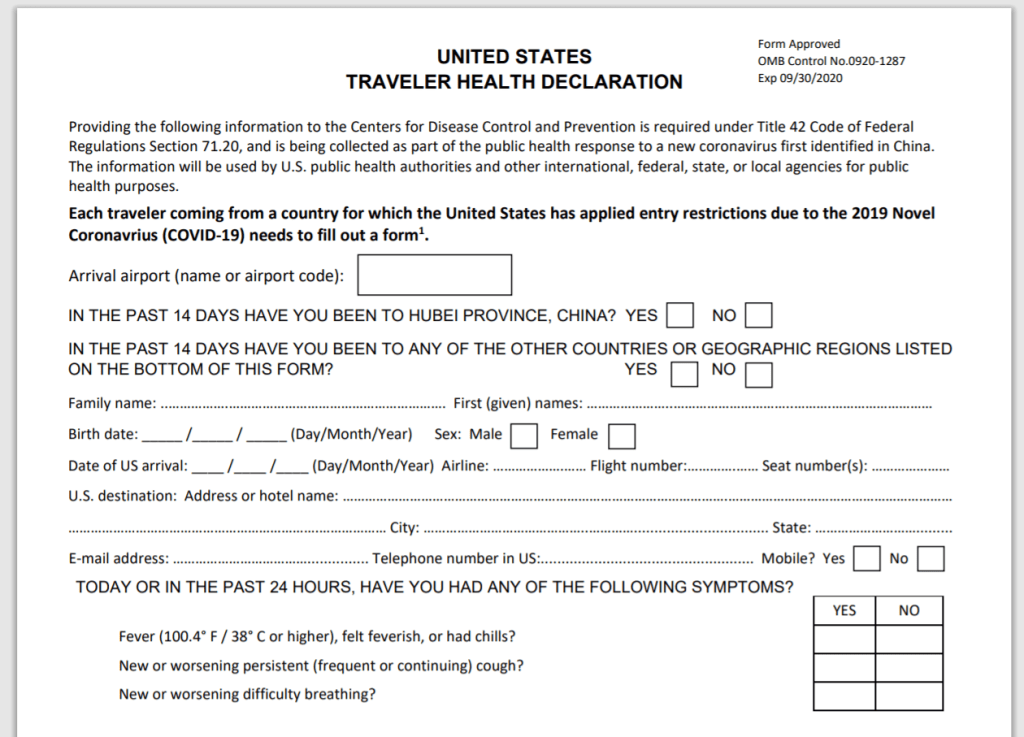 As we boarded we were given a Health Declaration Form, to be filled out before we landed. It inquired about where we’d been overseas, if we had any symptoms, and where we would be staying in the U.S.