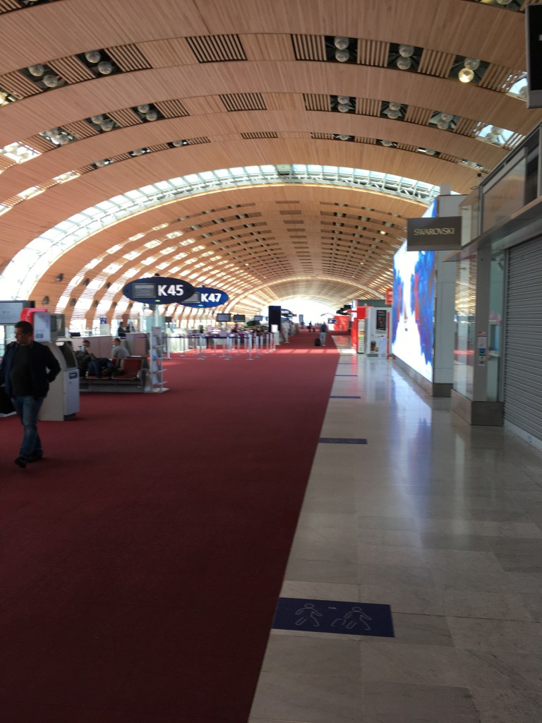 Paris Orly airport is temporarily closed and all flights have been consolidated into Charles de Gaulle airport, Terminal 2, and the eerie emptiness started at the drop-off point. There were just a few cars discharging passengers, no curb-side staff, many terminal doors were blocked off, and trash blew along the sidewalk. I would not have been surprised to see a tumbleweed go by.
