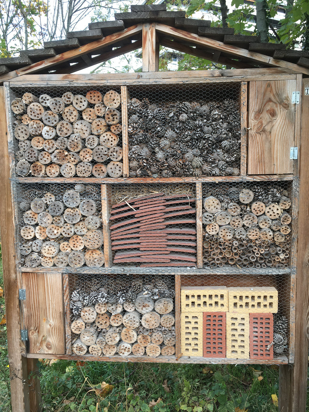 Usually installed in quiet places and close to flower beds, insect hotels are made from reclaimed and environmentally-friendly materials such as untreated pallet wood, stems, logs, and sandy soil.