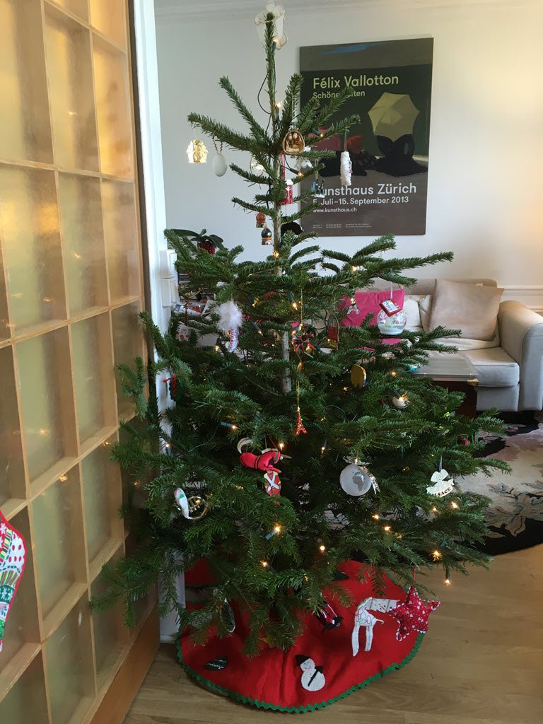 We have a small apartment, so we scaled our tree accordingly and Marti has a great collection of decorations. Here’s our tree, ready for presents to be placed beneath it: