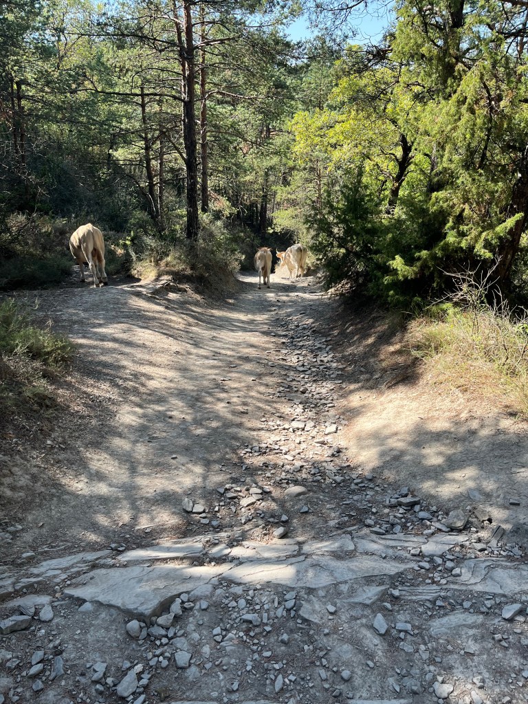 The thing about the walk to Zubiri is that the last kilometer or so is really hard. It’s a steep downhill and the path goes over jutting rocks and slabs. As I mentioned earlier, it’s dangerous and requires careful attention to where you’re putting your feet. Imagine my surprise when, in the middle of this section, I found I was sharing it with a herd of cows!