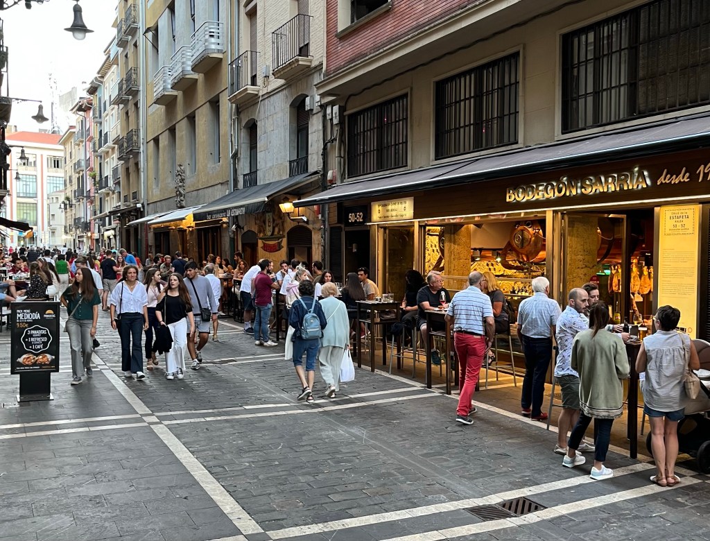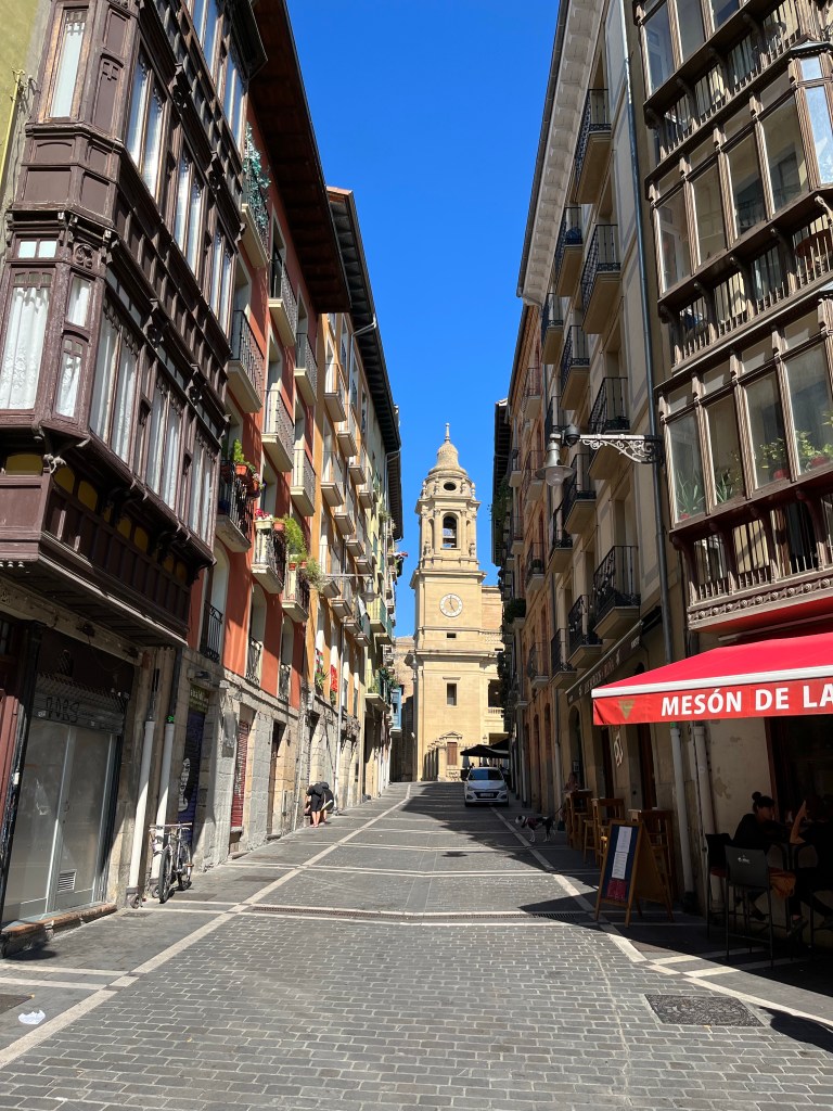 I went to Calle Estafeta last night, which is pincho Ground Zero and dug in. For 4-5 euros, you get a pincho of your choice and a glass of wine (and a healthy pour, at that). My favorite last night was a sauteed artichoke and sweet onion plate. While it’s financially feasible to go from bar to bar, having a pincho at each stop, the amount of wine you get would slow you down quickly. I cut myself off at two pinchos, determined not to court a hangover this morning, Sitting outside along the street lets you enjoy your pincho and wine and take in the passing scene.