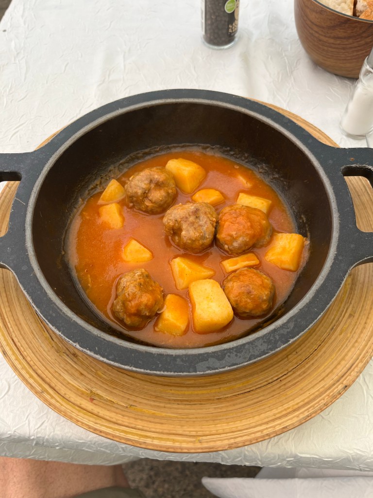 When I was taking “ALM Spanish” in junior and senior high school, one of the first food words we were taught was albondigas. Perhaps because spaghetti with meatballs was on offer every Wednesday in the school cafeteria. So when I decided to eat lunch at a plaza-side cafe today and a familiar menu item caught my eye, I had to order it.