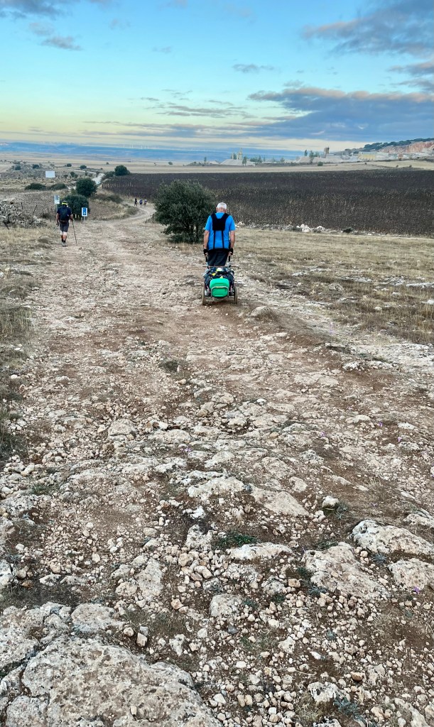 Dawn saw a line of pilgrims exiting Atapuerca and heading uphill through the surrounding farm fields. I thought the rocky trails of the last few days were bad, but this one took the cake. It was awful. Usually, the bad paths have a smoother tire track or border that pilgrims have worn down but this had none of that. 110% of my attention was required to be sure where my feet were going; I barely noticed the scenery.