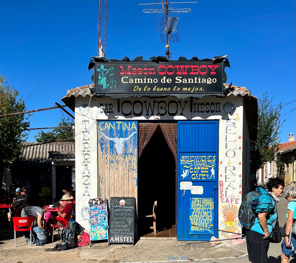 I took my halfway point break at the town of Reliegos where, this being Sunday, nearly everything was closed. The one bar open at 11:00 AM was very popular with pilgrims! There were endless calls for cafe con leche.