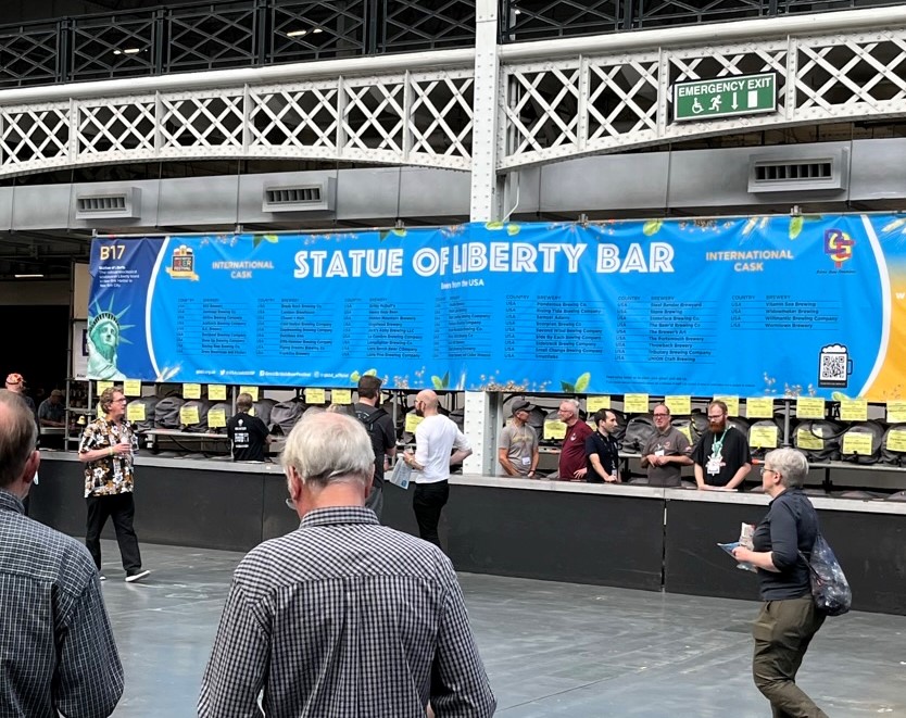 Olympia is a vast space with two big halls and, in it, the GBBF featured 18 bars offering beverages grouped by categories, food stalls, and merchandise vendors. For example, all the beers, some 65 of them, from the US were served at the “Statue of Liberty” bar. Hmm – so many beers, so little time. I consulted the online beer list the previous evening and made a plan. Well, one had to, or risk being lost.