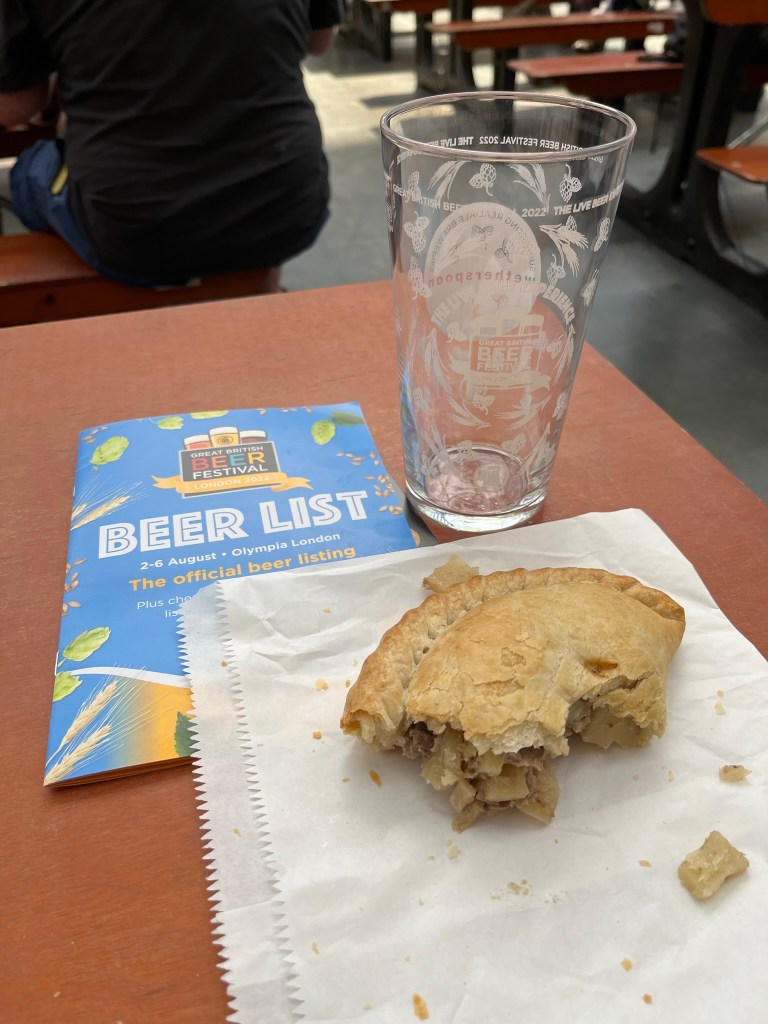 It’s important to lay in a good foundation before starting to drink at these affairs, so I went to the Handmade Cornwall Pasties booth and bought a “Moo and Blue” (that’s steak and Stilton cheese) pasty: